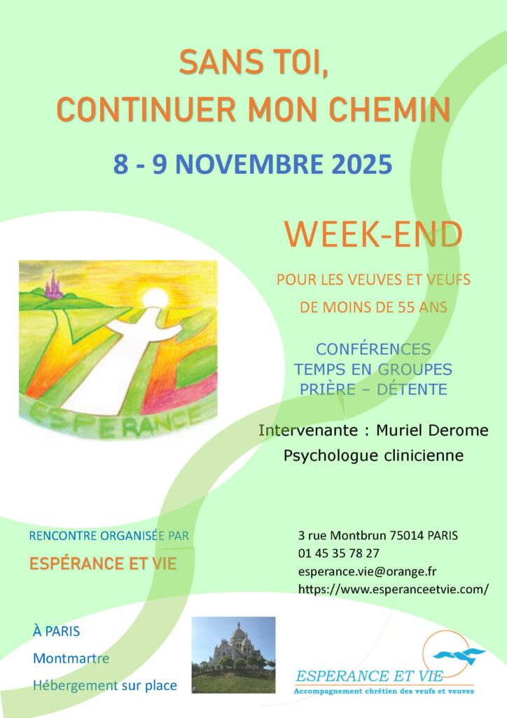 Le mouvement Espérance et Vie organise les 8 et 9 novembre 2025 un week-end pour les veuves et les veufs de moins de 55 ans. Il se tiendra à Paris, à l’Hôtellerie de la Basilique du Sacré Cœur de Montmartre.